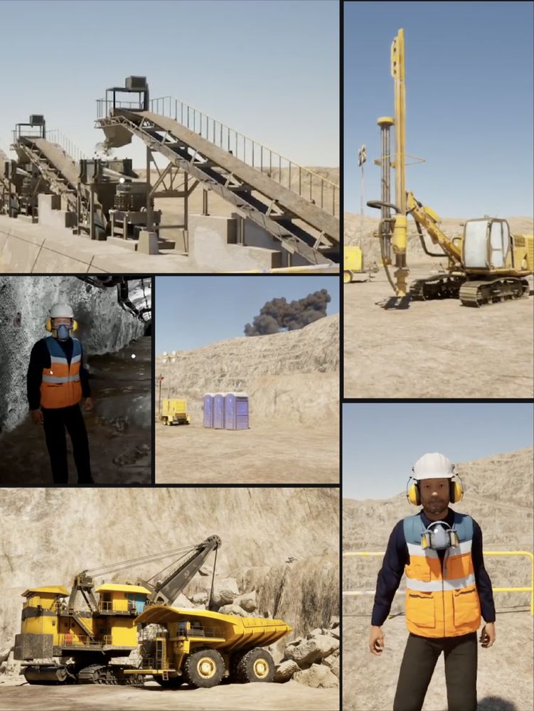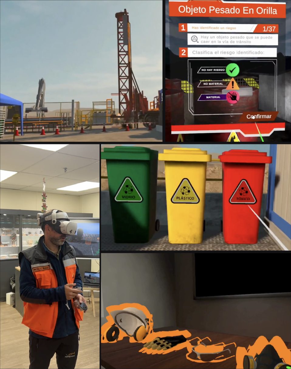 Recreación 1:1 de la faena real en Calama con apoyo de Prevención de Riesgos de BHP. Escenarios día/noche, distintas perforadoras, gamificación incorporada. Los operadores exploran el entorno como si estuvieran físicamente presentes.
